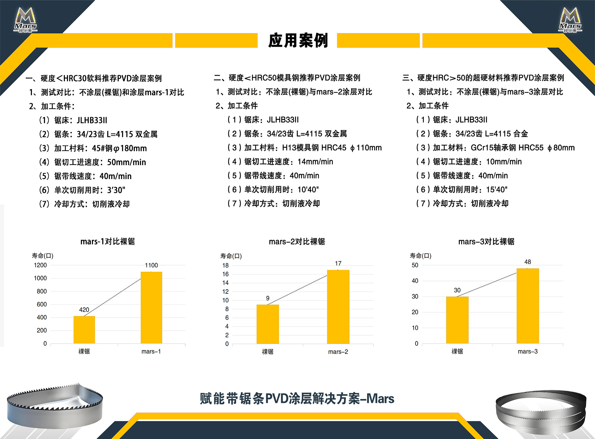 現(xiàn)有涂層有mars-1、mars-2等涂層解決方案,主要應(yīng)用于雙金屬帶鋸條,mars-3涂層解決方案,主要應(yīng)用于硬質(zhì)合金鋸條。